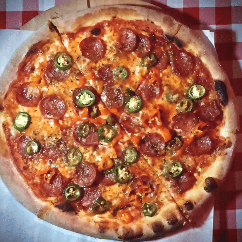 sos pomidorowy, ser mozzarella, salami salsiccia piccante (salami pikantne-dojrzewające), papryczki jalapeno, papryczki habanero