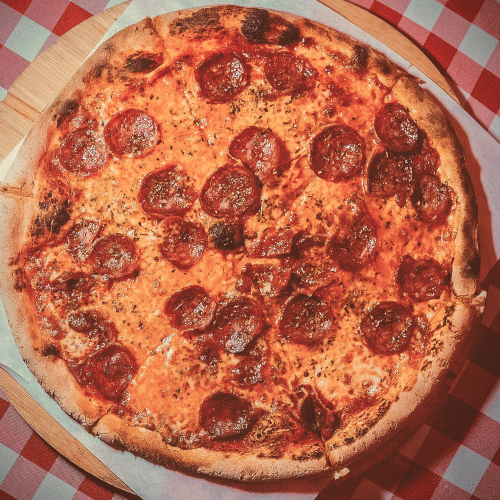 sos pomidorowy, ser mozzarella, salami salsiccia piccante (salami pikantne-dojrzewające)
